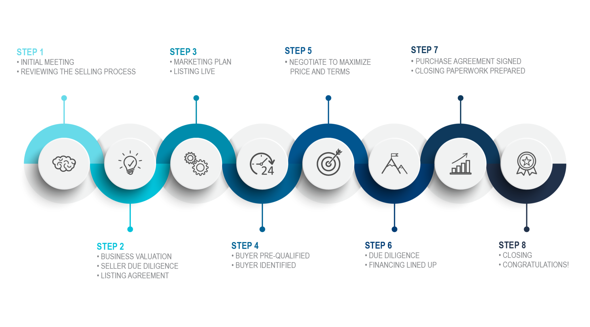 From initial consultation through business valuation and analysis to developing a strategic plan, we take holistic approach for each client allowing us to create a customized road map for a smooth transaction.